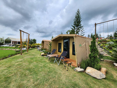 ห้อพักสไตล์ Camping แต่อยู่คนละโซน ตกแต่งด้วยผ้าใบเต็นท์ ห้องน้ำในตัว พร้อมสิ่งอำนวยความสะดวกอื่นๆ ห้องพักโซนนี้จะอยู่หลังบ้าน Home Mountain มองเห็นวิวฝั่งหลังไร่ซึ่งสวยไม่แพ้กับโซนอื่น หากลูกค้ามากันครบ 3 ห้องจะมีความเป็นส่วนตัว ลูกค้าสามารถจัดที่นั่งทานอาหารเย็น โดยทางไร่ได้จัดเก้าอี้สนาม และเต็นท์ ผ้าใบให้บริเวณหน้าห้องพัก เหมาะสำหรับลูกค้าทุกกลุ่ม มีมุมถ่ายรูปสวยๆ เสริมผู้ใหญ่ได้ห้องละ 1 ท่าน สะดวกสบาย ใกล้ที่จอดรถ